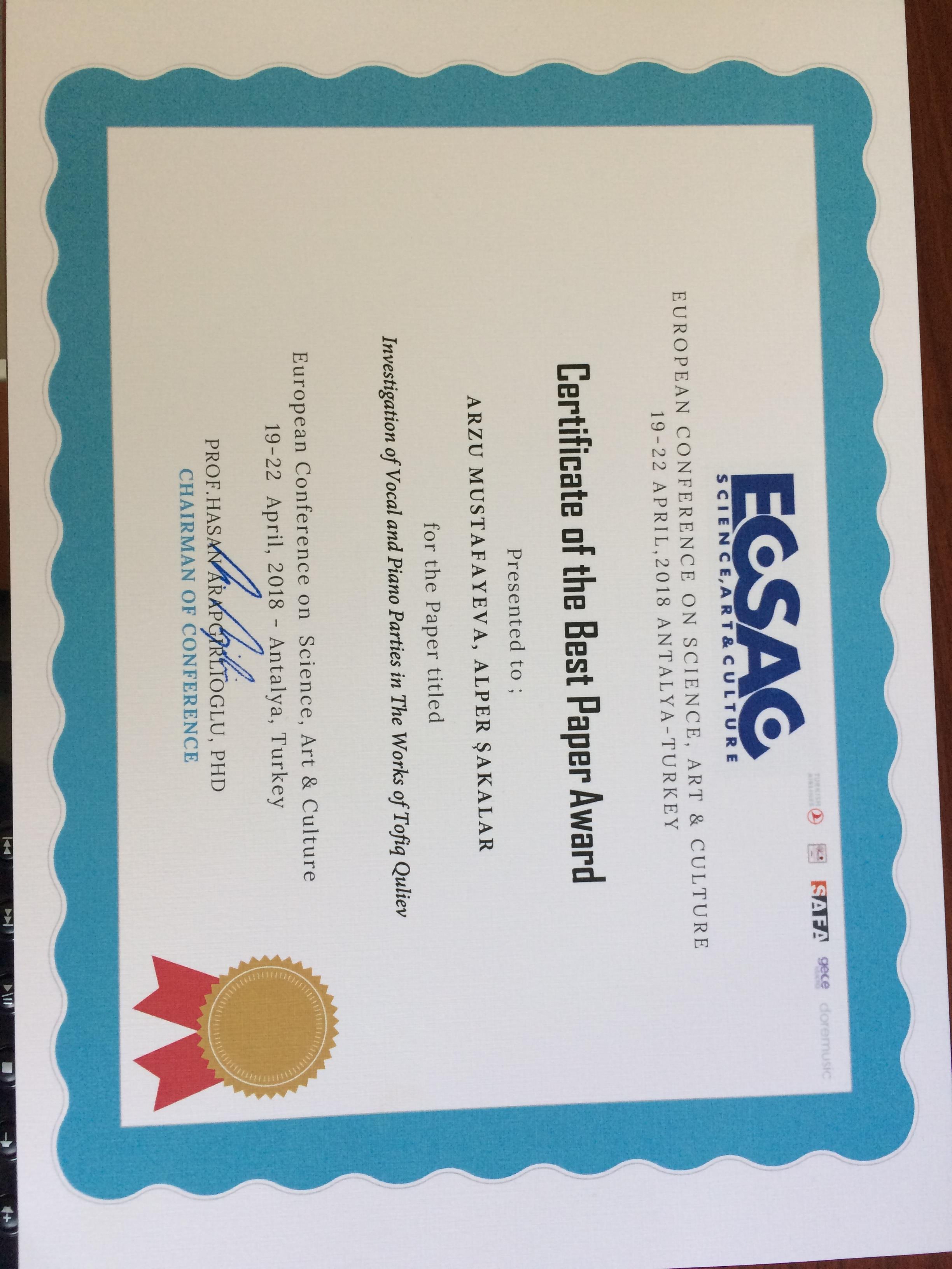 Güzel Sanatlar Bölümü öğretim elemanlarından Öğr. Gör. Dr. Arzu MUSTAFAYEVA, Güzel Sanatlar Fakültesi öğretim elemanlarından Öğr. Gör. Alper ŞAKALAR ile birlikte katıldığı; 19-22 Nisan 2018 tarihleri arasında Antalya’da düzenlenen Uluslar arası Bilim, Sanat ve Kültür Sempozyumunda (ECSAC) gerçekleştirilen 500 sunum içerisinden “Investigation of Vocal And Piano Parties İn The Works Of Tofiq Quliev” isimli sunum ile birincilik ödülü almışlardır.